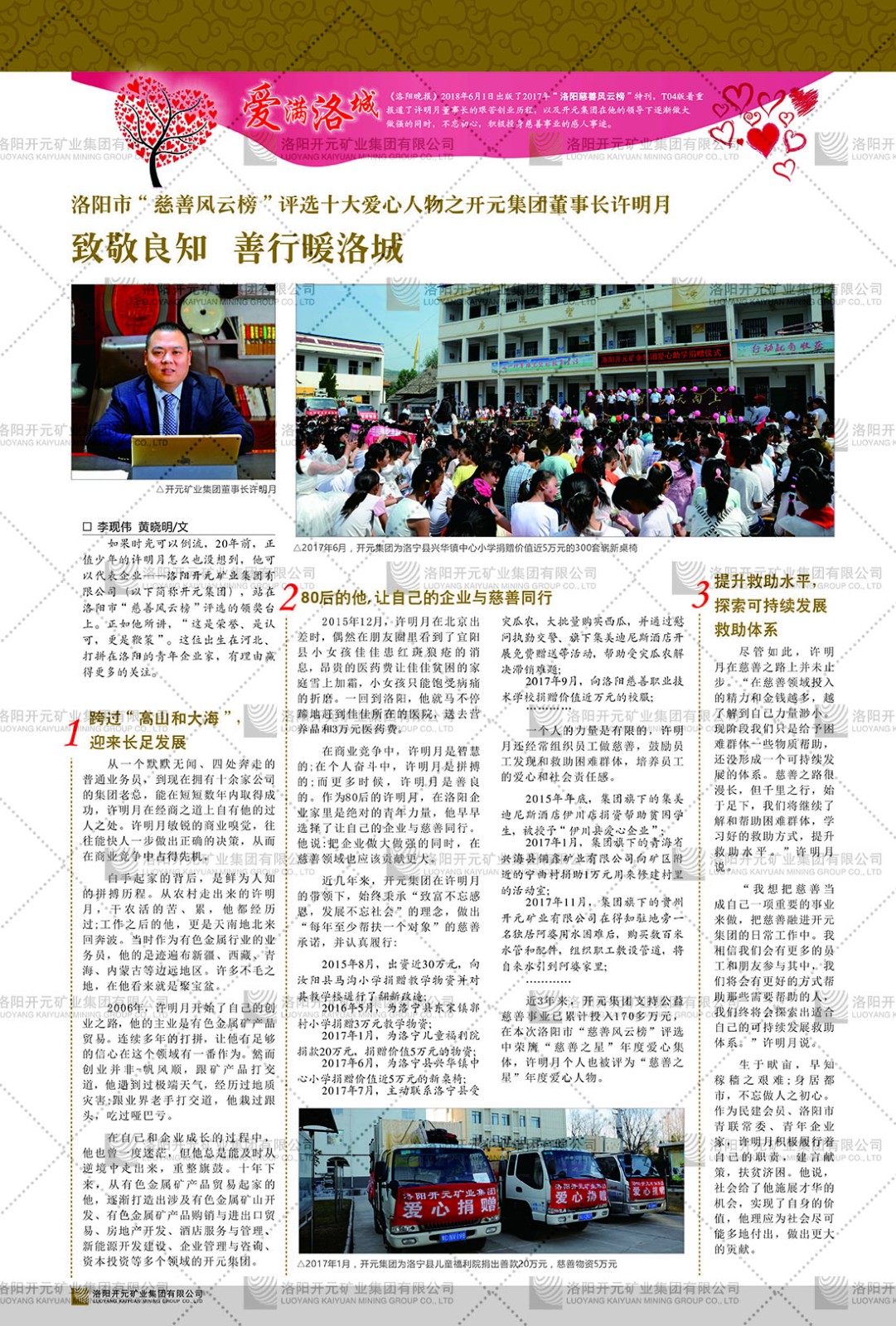 洛陽開元礦業(yè)集團有限公司簡介洛陽開元礦業(yè)集團有限公司,始成立于2006年,位于洛陽市開元大道269號。集團旗下共有十余家全資子公司,業(yè)務涉及有色金屬礦山開發(fā)、礦產(chǎn)品購銷與進出口貿(mào)易、房地產(chǎn)開發(fā)、文化藝術、企業(yè)管理與咨詢、資本投資等多個領域。2024年,集團公司銷售總額達7.8億元。民建河南省委委員、民建河南省委企業(yè)委副主任、民建洛陽市委委員、企業(yè)委主任、洛陽民建企業(yè)家協(xié)會會長許明月是公司創(chuàng)始人,現(xiàn)任洛陽開元礦業(yè)集團有限公司董事長。在礦業(yè)領域,洛陽開元礦業(yè)集團擁有多家實力雄厚的子公司:貴州開元礦業(yè)有限公司探、采礦權面積共11.33平方公里;興??h銅鑫礦業(yè)有限公司探礦權面積8.76平方公里,礦山資源潛力巨大;2021年,開元集團與盧氏中科礦業(yè)有限公司開展戰(zhàn)略合作。盧氏中科礦業(yè)有限公司專注于有色金屬的浮選、加工和銷售,擁有強大的技術支撐平臺,是集探、采、選、冶、研為一體的中大型綜合礦業(yè)企業(yè)。目前,盧氏中科王家河1000噸選礦廠已成功投產(chǎn),雙河金礦、柳關欒盧鉛鋅礦相繼順利開工,樓房銀礦與圪老灣鉛鋅礦的深部探礦重大突破,標志著礦山版圖取得重大進展,為開元集團后續(xù)發(fā)展奠定了堅實基礎。在文化傳媒領域,洛陽市明月美術館通過豐富多樣的藝術展覽、學術研討和公共教育活動,努力打造一個集展覽、交流、教育、研究為一體的綜合性藝術平臺。此外,在金融投資領域,開元集團旗下的北京明峰資本管理有限公司專注于投資具有高增長潛力的優(yōu)秀企業(yè),特別是高科技、新能源、環(huán)保等新興產(chǎn)業(yè),為客戶提供個性化的資產(chǎn)配置服務。在做好企業(yè)經(jīng)營的同時,開元集團始終不忘企業(yè)的社會責任和家國情懷,以突出的愛心公益事跡,開展了一系列公益慈善活動:“民建林”公益事業(yè)通過“思源基金”“幫幫公益”線上公益平臺,與眾多愛心人士籌措資金20余萬元;資助541名貧困大學生共計270余萬元,推進“數(shù)字助力——河南AI人才培養(yǎng)”;捐款10萬元,馳援京津冀、黑龍江洪水地質災害……公司于2017年底被洛陽市慈善總會評為“洛陽慈善風云榜——十大愛心集體”。洛陽開元礦業(yè)集團有限公司秉承持續(xù)發(fā)展理念,憑借多年來良好的企業(yè)信譽與經(jīng)營業(yè)績,與全國多家企業(yè)建立了良好合作關系,受到社會各界的一致好評,多次榮獲“納稅標兵”“先進企業(yè)”“招商引資模范企業(yè)”等榮譽稱號。回望來時路,開元人勠力同心,以“闖”的精神和“創(chuàng)”的勁頭,一路披荊斬棘,踏過千山萬水;展望新未來,開元人凝心聚力,不執(zhí)于“舊”,無畏于“新”,秉承“勇于跨越,追求卓越”的企業(yè)精神,乘著國家高質量發(fā)展新征程的東風,跨過高山,越過大海,向著集團多元化、國際化的目標,逐夢遠航,跨越前行!